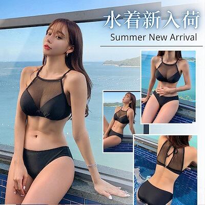 レディース 水着 ビキニ 2点セット シースルー セクシー水着 女性水着 セパレーツ 透け感 上下セット タンキニ スイムドレス ビーチウェア ブラック水着 単色水着 ック ワイヤー入り メッシ