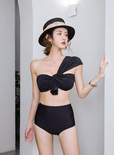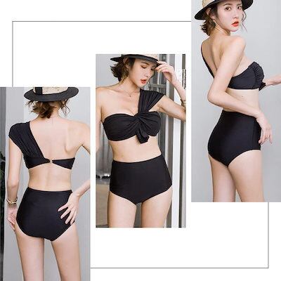 ワンショルダー 水着 2点セット ビキニ 水着 セパレート 水着 レディース 体型カバー バンドゥ ビキニ ハイウエスト 盛れる リゾート リボン セクシー オトナ 二の腕 お腹
