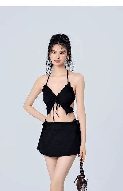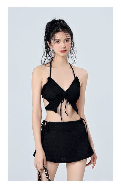 【大好評】黒色のストラップ付きビキニ3点セット セパレートタイプレディース水着 小胸向け 背中見せセクシーな透かしデザイン まるで妖精のような温泉用スイムウェア