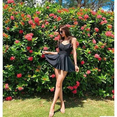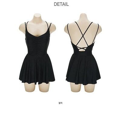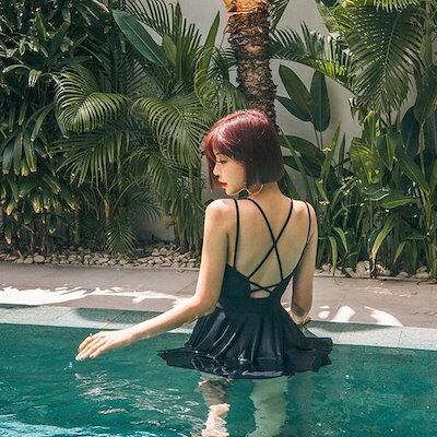2025春夏新作 水着レディース 体型カバー 水着 ワンピース型 サロペット 黒 背中出し 小胸バンドゥ 水着 韓国風