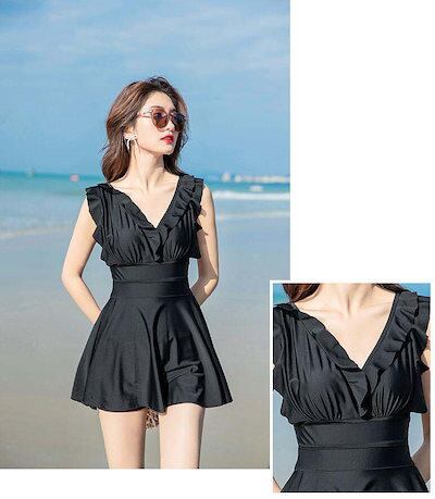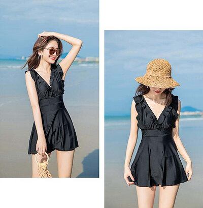 韓国風 ワンピース水着 レディース 体型カバー水着 ミセス ママ水着 20代 30代 40代 オトナ女子 大きいサイズ オールインワン 無地 可愛い 小胸 バスト 盛れる 黒 女性 フリル 露出控えめ