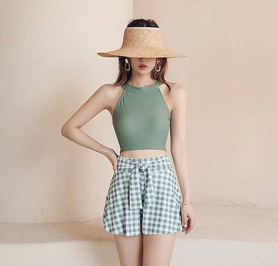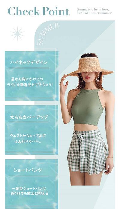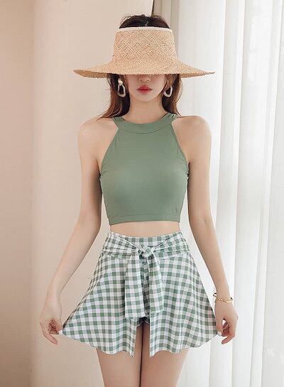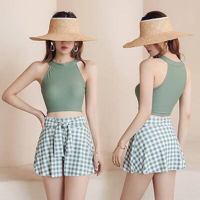 水着 タンキニ 韓国 かわいい 水着 レディース 体型カバー 可愛い ハイネック 小胸 水着 露出控えめ 水着 スカート グリーン チェック柄 セパレート 上下セット 安全パンツ みずぎ 学生