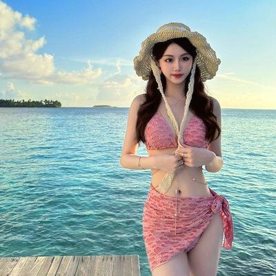 連体水着2025新型純欲風ピンク別体ビキニ3点セット水着女性セクシー甘ギャル小胸チェーン