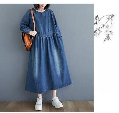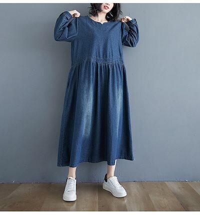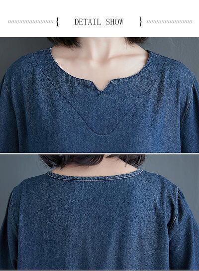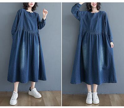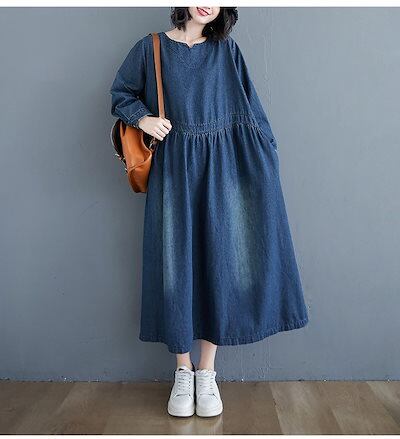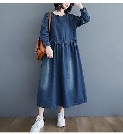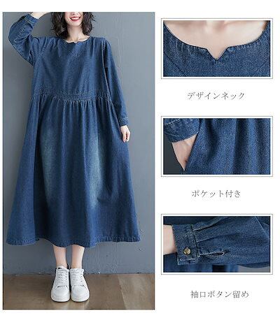 デニムワンピース ロング丈 春 きれいめ フレアワンピース マキシワンピ レディース 大きいサイズ 長袖 体型カバー ゆったり ウエストタック ポケット付き