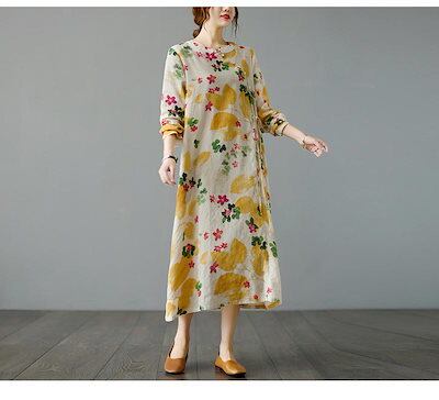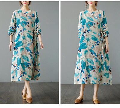 マキシワンピース フレアワンピ ワンピ ロングワンピース ロングワンピ 綿 レディース 長袖 総柄 花柄 プリント デザインネック 斜めボタン ウエスト紐づき ポケットづき チャイナ風ワンピース ゆっ