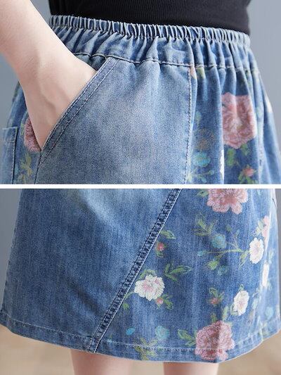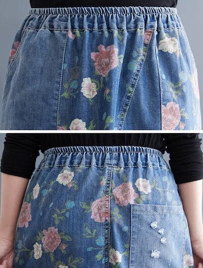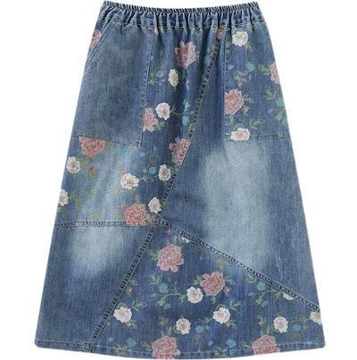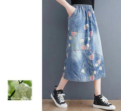 デニムスカート フレアスカート 花柄 ウエストゴム スカート デニム  ダメージ ミモレ丈 ひざ丈 ロング Aライン   ボトムス レディース 大きいサイズ L 2L 3L