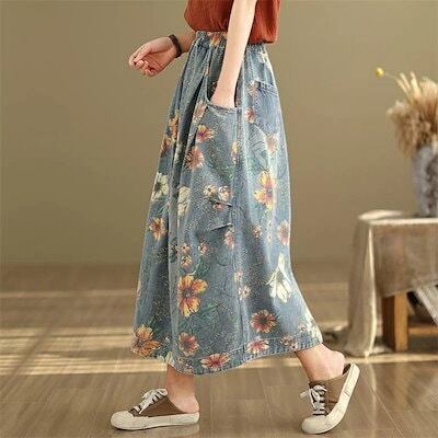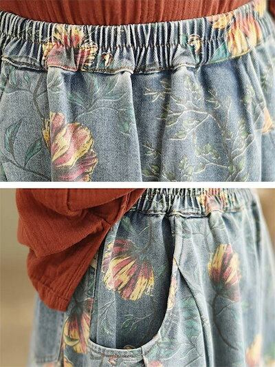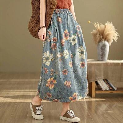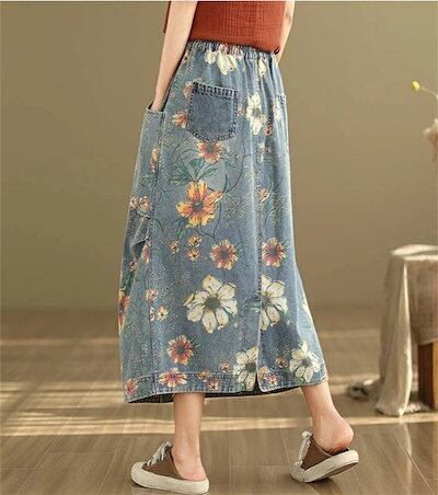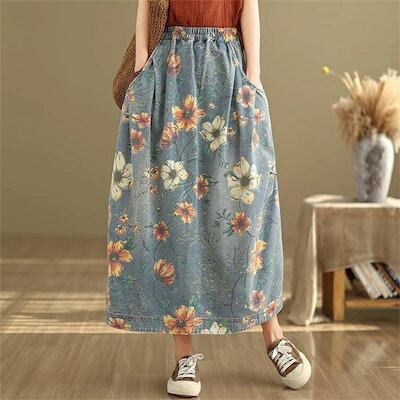 デニムスカート スカート デニム レディース 春夏 ロングスカート ロング丈 花柄スカート ポケット 花柄 ウエストゴム ボトムス ゆったり 体型カバー 着?せ レトロ感 カジュアル シンプル 可愛い
