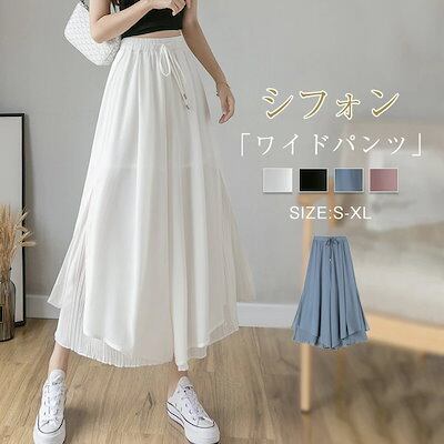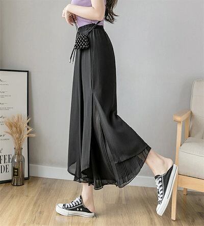 キュロットスカート パンツ レディース 春夏 ワイドパンツ シフォン 九分丈 シフォンスカート プリーツ プリーツスカート リラックス ウエストゴム カジュアル ゆったり 柔らかい 伸縮性 無地 体型