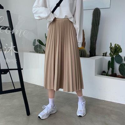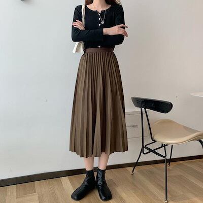 プリーツスカートロングスカートレディース女性ボトムスロング丈ミモレ丈ゴムウエストAライン無地ブラックブラウンベージュシンプル