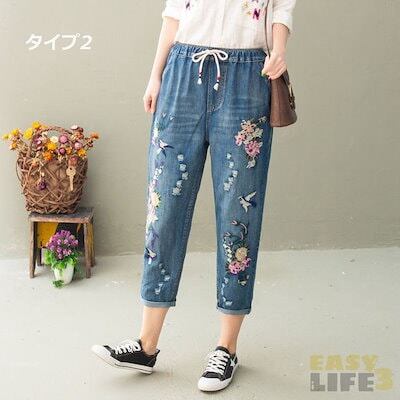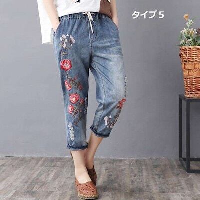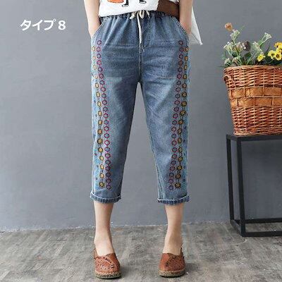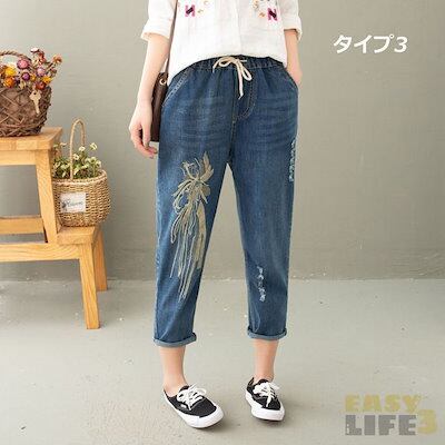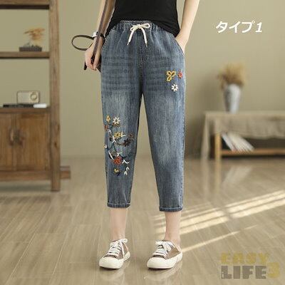 大好評 デニムパンツ ジーンズ ジーパン ストレート レディース ガールズ 大きいサイズ ウエストゴム デニム ジーパン 春 夏 刺繍 花柄 ジーンズ パンツ 春 夏 秋 ゆったり 七分丈 おしゃれ