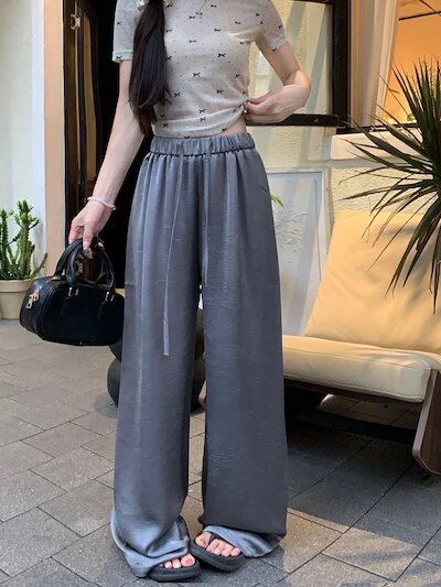 2024 春夏パンツ ロング丈 ウエストゴム ワイド ストレート ハイウエスト 美脚効果 脚長効果 細見え 夏 白 黒 おしゃれ かわいい 韓国ファッション レディース お出かけ