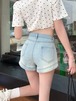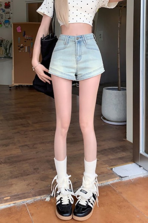 2024 春夏パンツ ショート丈 デニム ジーンズ ハイウエスト 美脚効果 脚長効果 細見え 夏 水色 ライトブルー 韓国ファッション レディース かわいい おしゃれ カジュアル お出かけ