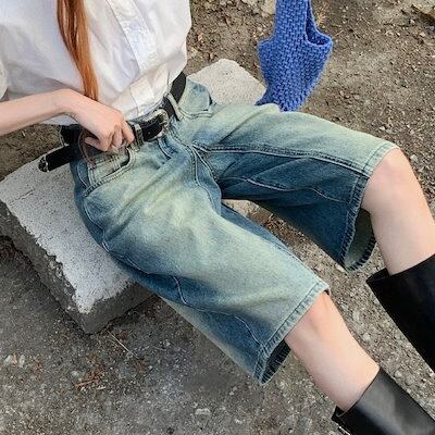 2024 夏 韓国パンツ ハーフパンツ 五分丈 デニム ジーンズ ワイド レトロ グラデーション ハイウエスト 美脚効果 脚長効果 細見え 夏 ウォッシュ加工 韓国ファッション レディース かわいい