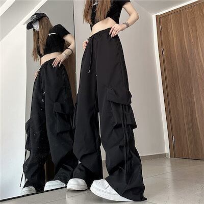 2024春夏カーゴパンツ ロングパンツ ルーズ ワイドパンツ ワイドレッグ ボトム ハイウエスト ポケット付き シンプル カジュアル 韓国ファッション