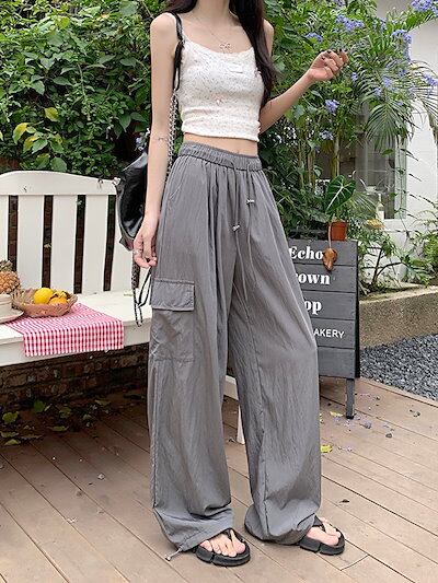 2024春夏パンツ ロング丈 モップパンツ カーゴパンツ ワイド ストレート ウエストゴム ハイウエスト 美脚効果 脚長効果 細見え 夏 黒 韓国ファッション レディース かわいい おしゃれ カジュア