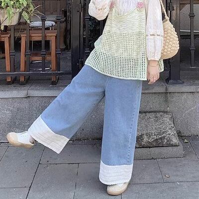 2024春夏パンツ デニム ジーンズ ワイド ストレート レース ハイウエスト 脚長効果 美脚効果 細見え 春 ブルー 青 カジュアル おしゃれ かわいい シンプル 韓国ファッション レディース お出
