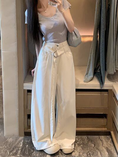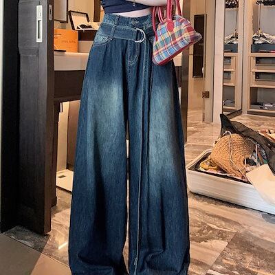 2024夏 韓国パンツ デニム ジーンズ ロング丈 ワイドレッグ ウォッシュ加工 ベルト ハイウエスト 美脚効果 脚長効果 細見え 夏 白 青 おしゃれ かわいい 韓国ファッション レディース お出か