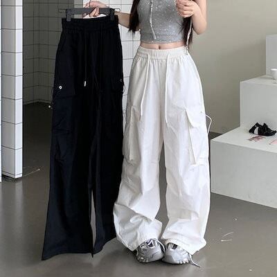 2024春夏パンツ ロング丈 ポケット ワイド ストレート ウエストゴム ハイウエスト 美脚効果 脚長効果 細見え 夏 白 黒 おしゃれ かわいい 韓国ファッション レディース お出かけ