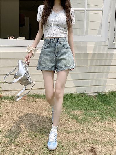 2024 春夏パンツ ショート丈 デニム ジーンズ ワイド ハイウエスト 美脚効果 脚長効果 細見え 夏 水色 白 おしゃれ かわいい 韓国ファッション レディース お出かけ