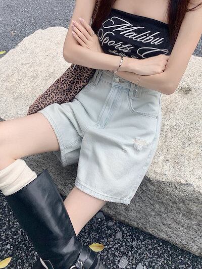 2024 春夏パンツ ハーフパンツ デニム ジーンズ ワイド ストレート ハイウエスト 美脚効果 脚長効果 細見え 夏 白 水色 おしゃれ かわいい 韓国ファッション レディース お出かけ