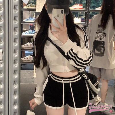 上下セット 2点セット アウター ボトムス 長袖 パンツ ショート 薄手 日焼け止め スポーツ おしゃれ 可愛い ストライプ ジッパー 休日 スタイルアップ お出かけ 色っぽ 女っぽ 夏秋 トラック