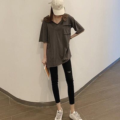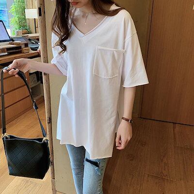 夏服 新作 Vネックtシャツ 半袖 レディース ゆったり 大きいサイズ 半袖 トップス 怠惰な風 薄手 カジュアルTシャツカットソー ロングTシャツ体型カバー Tシャツ