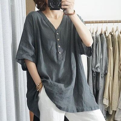大きいサイズ ゆったり 夏服 Tシャツ カジュアル 麻ブラウス 薄手 怠惰な風 百掛け Tシャツ 半袖 トップス Vネック着痩せ カジュアル 体型カバーTシャツカットソー 無地
