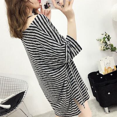 Tシャツカットソー 大きいサイズ tシャツ 半袖 レディース 夏 韓国ファッション ゆったり Vネック 着痩せ 半袖トップス 体型カバー ストライプTシャツ 怠惰な風 ロングTシャツ ?薄 冷感 部屋