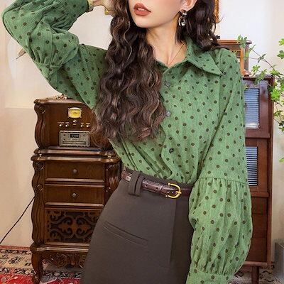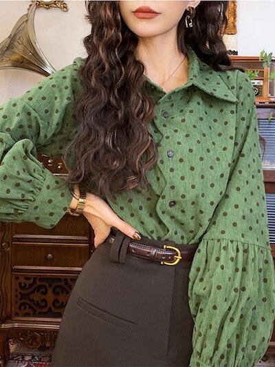長袖シャツ トップス レトロ波点 グリーン コーデュロイのシャツ ポロシャツ ファッション 百掛け やせて見える