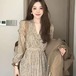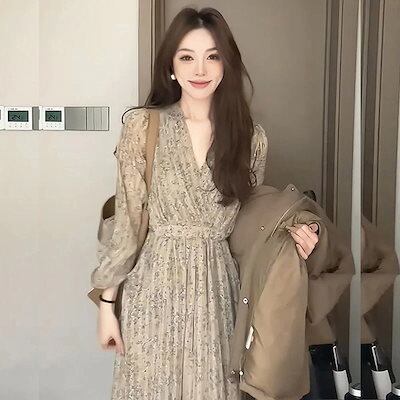 花柄ワンピース 2024 秋 新作 Vネック花柄長袖シフォンドレス女性秋プリーツティーブレークロングドレス