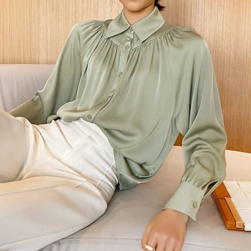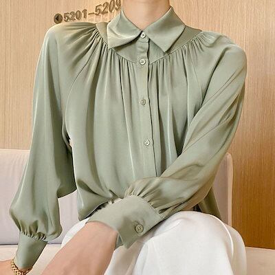 今っぽシアーシャツ ランタンスリーブ シルキー ドレープ レディース プランジングスリーブ 気質 サテン シック トップス 韓国