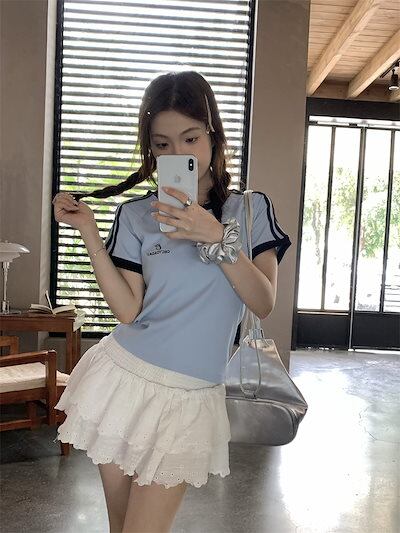 2024 春夏トップス 大人可愛い風半袖 Tシャツ 韓国 ラウンドネックロゴスリム かわいいへそ出し ショートおしゃれスリーブカジュアルサイドコーデ丈ファッション系レディースストリートお出かけ T