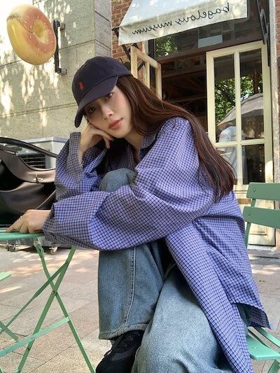 2024秋冬トップス シャツ 長袖 チェック柄 ボタン 襟 スタンダードカラー 秋 青 ブルー おしゃれ かわいい きれいめ 大人っぽい 韓国ファッション レディース お出かけ