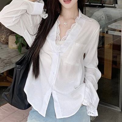 2024秋冬トップス シャツ 長袖 Vネック レース ガーリー 甘め キュート 秋 白 ホワイト おしゃれ かわいい きれいめ 大人っぽい 韓国ファッション レディース お出かけ