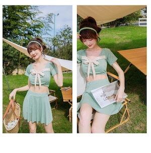 2024 3色 半袖水着 タンキニ 2点セット ツーピース リボン フリル 着痩せ ガーリー プリティ キュート レトロ スリム ミニ ショート丈 可愛い 大人 お姉さん イイ女 スタイルアップ モテ