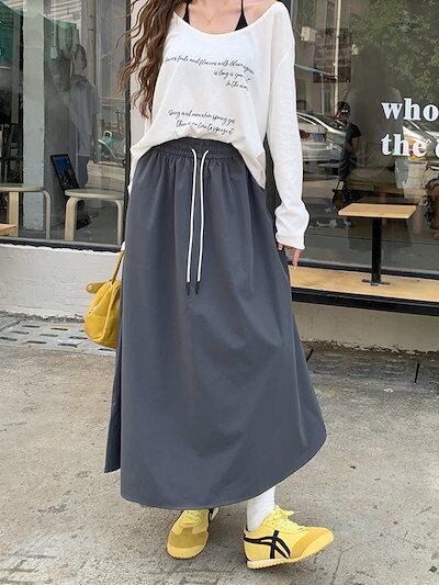 2024 秋冬スカート ミモレ丈 Aライン ウエストゴム ハイウエスト 美脚効果 脚長効果 細見え 秋 白 黒 水色 おしゃれ かわいい 韓国ファッション レディース お出かけ