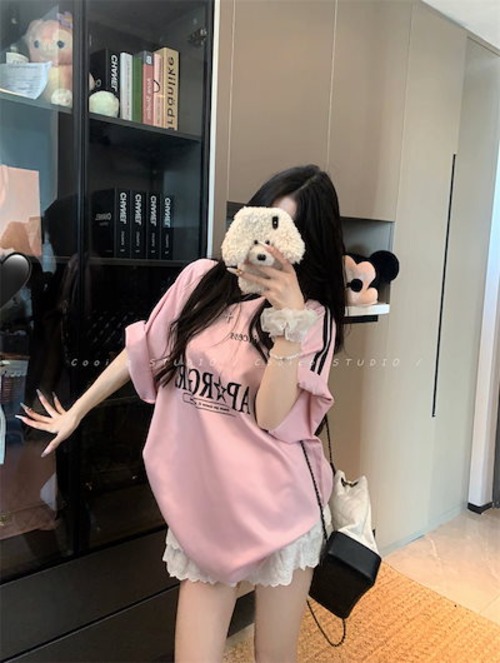 2024夏 韓国可愛い風トップス Tシャツ ファッション 半袖 スリムフィット サイド ペイントシルエットゆったり丈 休日レディースサイズ韓国Vネック おしゃれ カジュアル メンズライク T