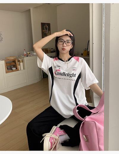 2024夏 韓国可愛い風トップス Tシャツ ファッション 半袖 スリムフィット サイド ペイントシルエット ゆったり丈 休日レディースサイズ韓国Vネック おしゃれ カジュアル メンズライク T