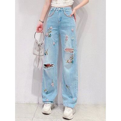ひんやりボトムス2024 デニムズボン レディース 新作 スートン 刺繍 ダメージ ストレート ワイドパンツ脚長効果!スキニーパンツ