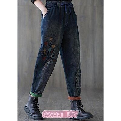 新品 大人気 サルエルパンツ デニム 刺繍 裏起毛 テーパードパンツ ボトムス ズボン レディース カジュアル ポケット付き ゆったり ウエストゴム 無地