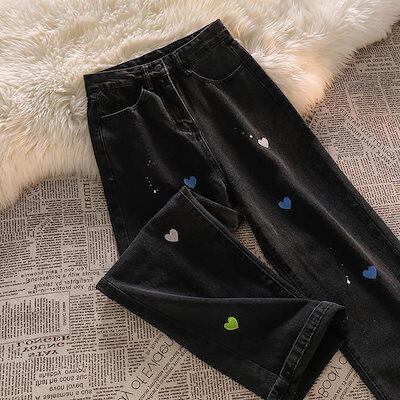 ストレート レトロ ハート ジョガ ーパンツ ジーンズ レディース ワイドパンツ ブラック デザイン感 刺繍