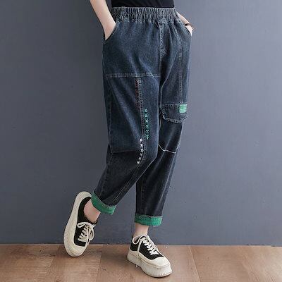大きいサイズレディースジーンズ九分丈 ハイウエストデニムロングパンツ可愛い刺繍大きなポケット韓国ファッションカジュアル春服