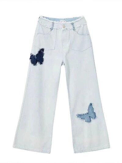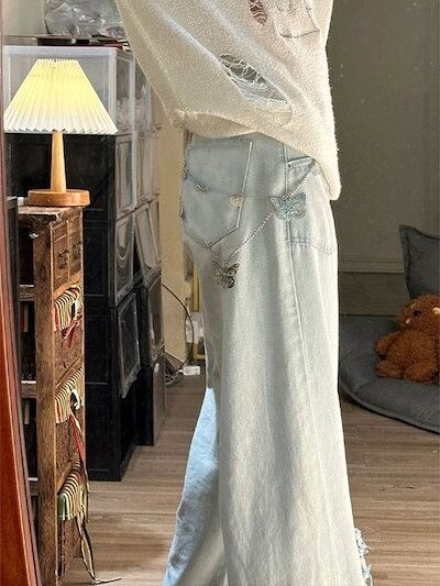 レディース デザインセンス ちょう 刺繍 ストレートパンツ アメリカ バリ ハイウエスト ジーンズ