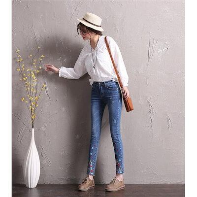 スキニー デニムパンツ レディース 刺繍 ボトムス 花柄 スリット 伸びる ジーンズ ストレッチ おしゃれ アンクル丈 カジュアル スリム 柔らかい