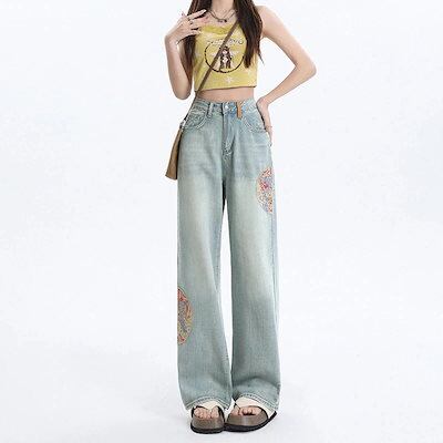中国風刺繍 デニムボトムス ワイドパンツ ジーンズ レディース ストレートパンツ ゆ ったり 快適性 着痩せ ハイウェスト ジョガーパンツ モップパンツ