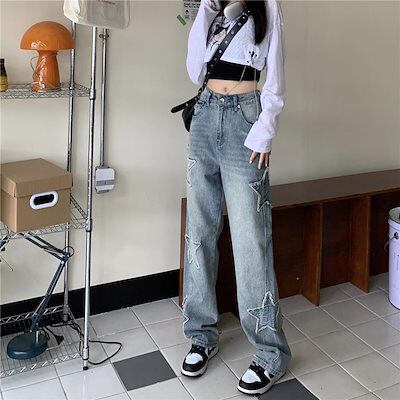 デザイン感 ジーンズ ハイウェスト ゆったり カラー刺繍 ロングパンツ ストレート ジーンズ ペンタグラムスター カーゴパンツ