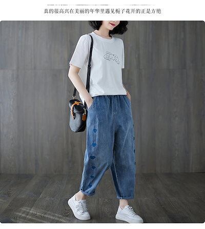 大きいサイズ テーパードパンツ にぴったり薄ジーンズハート刺繍ハーレムパンツウエストゴムパンツ321