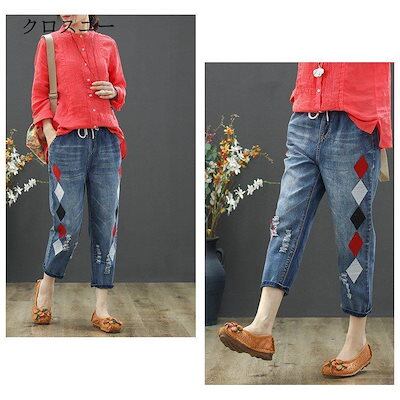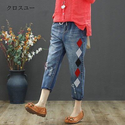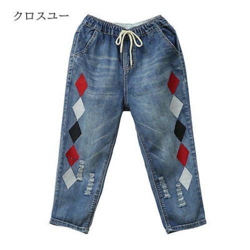 森ガール デニムパンツ レディース 大きいサイズ 菱形 ダメージデニム ウエストゴム ジーンズ 刺繍 美脚