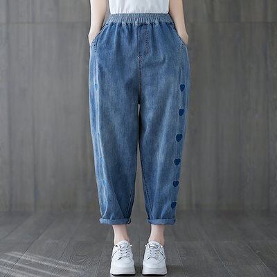 大きいサイズ テーパードパンツ にぴったり薄ジーンズハート刺繍ハーレムパンツウエストゴムパンツ3