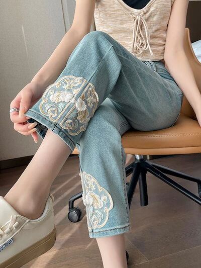 新中国風刺繍ジーンズ女性夏小柄狭版煙管ズボン梨形体ストレート9分ズボン